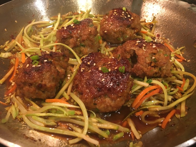 I had a fierce taste for meatballs and decided to make these Asian inspired baked turkey meatballs. They were extremely easy and tasty. Upon taking them out of the oven I wanted a little crunch on the outside so I seared about 4 of the meatballs in sesame oil, tossed in them in the sauce, and served with julienned carrots and broccoli (Trader Joe’s Broccoli Slaw) . I saved the rest and added the leftover meatballs to a salad, tacos, and even had them for breakfast with eggs later in the week – all delicious!