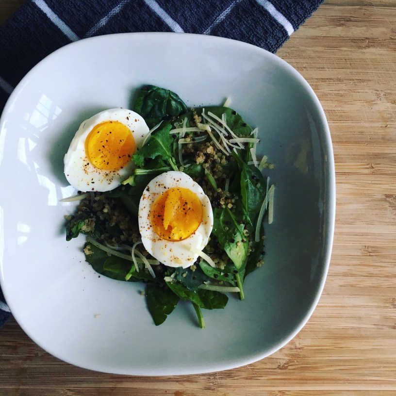 3. Slice the 7-minute soft boiled egg and place it over the quinoa and spinach